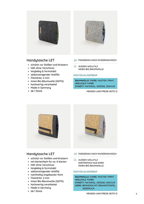 Notre gamme de produits comprend une variété d'articles promotionnels durables et de produits d'équipement pour les employés qui peuvent être adaptés individuellement à vos besoins. Des étuis pour téléphones et sacs à dos aux porte-clés et sous-verres en passant par les étuis pour tablettes et ordinateurs portables, nous proposons une large gamme d'options pour présenter votre marque de manière écologique.